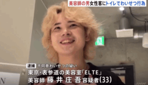 美容室「ELTE(エルテ)」に勤務していた美容師・**藤井庄吾容疑者(33)**が、女性客に対して不同意わいせつ行為をした疑いで警視庁に逮捕されました。
